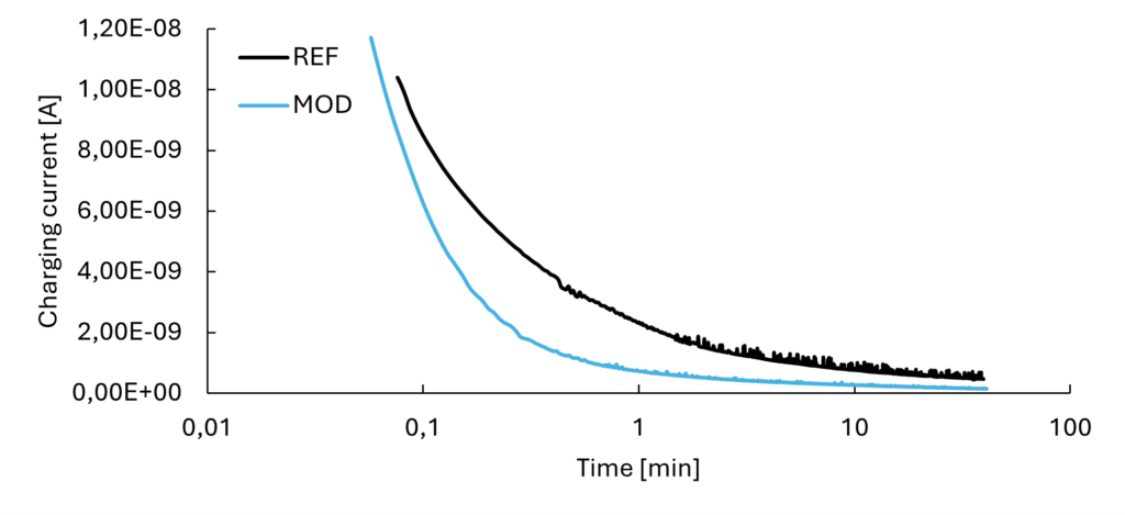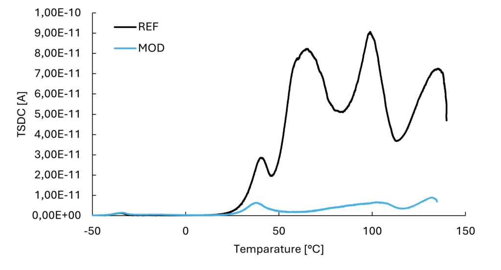 Chemical modification of PP resulted in a significant modification of charge trapping and reduction of total accumulated charge, as shown by the TSDC results (Figure 3). Also, the charging current stabilizes much faster at a lower value for the modified sample in comparison to the unmodified PP (Figure 2). This is in line with the TSDC results, indicating less space charge accumulation since the saturation in the charging current is achieved much faster.